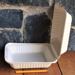 Contenedor tipo Almeja cuadrada de 9″x9″x3″ (22.86 x 22.86 x 7.62 cm), hecho de fibra de caña de azúcar prensada y termoformada. Biodegradable.